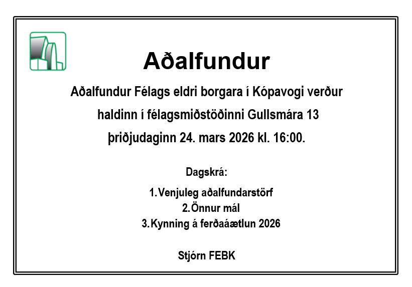 Aðalfundur FEBK verður haldinn í félagsmiðstöðinni Gullsmára 13 þriðjudaginn 24. mars kl. 16:00.