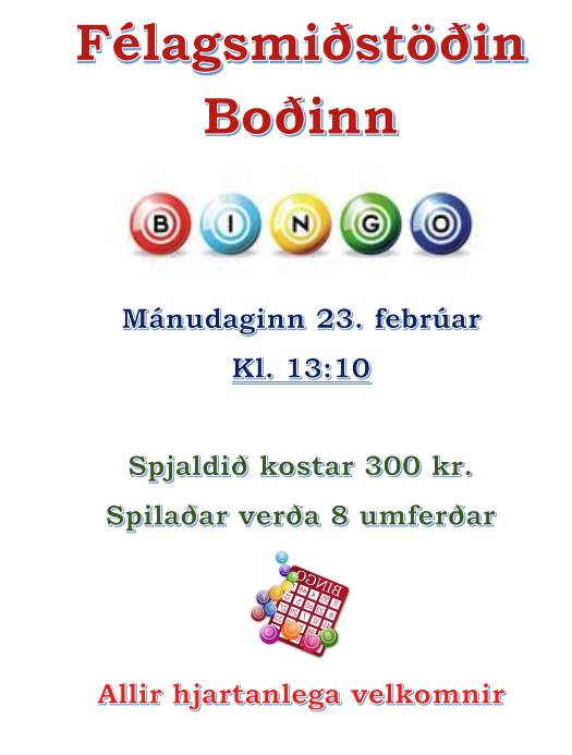 Bingó í Boðanum 19 feb Dagskrá Event details 23/02/2026 13:10 - 14:15 Contact event manager 6113 2026-02-23YOUR NAME* YOUR EMAIL* YOUR PHONE Food Choice 1 2 3 4YOUR MESSAGE Book your tickets 2026-02-23 00:00:00 Bingó í Boðanum-2026-02-23 https://febk.is/eventer/bingo-i-bodanum-11/edate/2026-02-23 Name* Your email* LAST NAME YOUR PHONE YOUR ADDRESS ADDITIONAL NOTES 6113 Choose tickets Offline payment $0 Credit or debit card Bank NameAccount No: 0000 1400 1211IFSC Code: 00001321Branch Address Back to details Thank you Kindly Event Bingó í Boðanum Date & Time 13:10 - 14:1523/02/2026 Order # 000000 Attendee Event Bingó í Boðanum Ticket Date & Time 13:10 - 14:1523/02/2026 PRINT febk