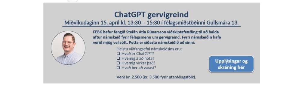 Í dag var haldið námskeið um gervigreindina ChatGPT sem var mjög vel sótt. Þetta var í annað skipti sem námskeiðið er haldið fyrir félagsmenn FEBK. Að þessu sinni var námskeiðið...
